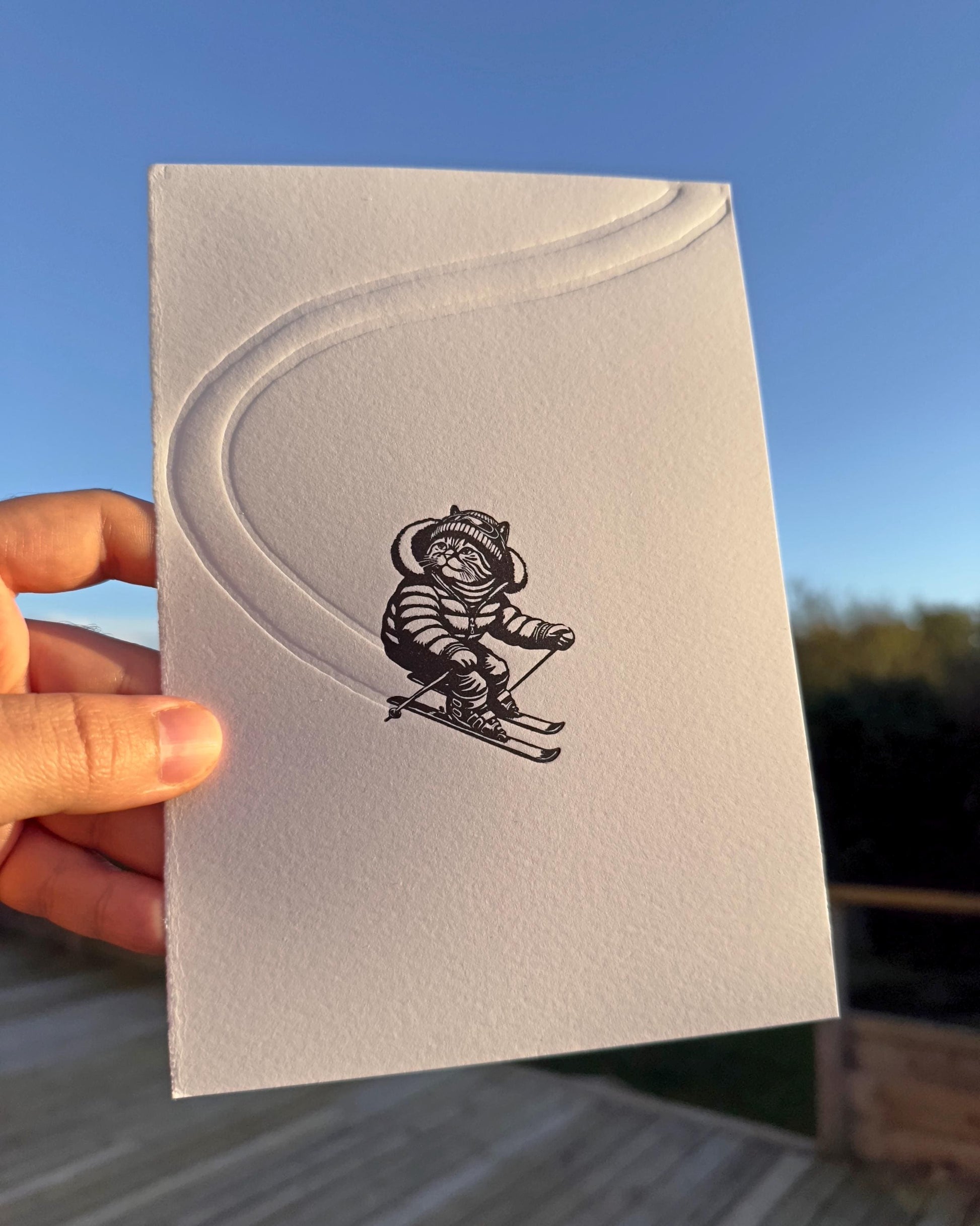 Our mini cat skiing down a mountainside. This print is our first to use embossing, which creates the impression of ski tracks. This is something we’ve been wanting to experiment with for a while, and we are so happy with the result.