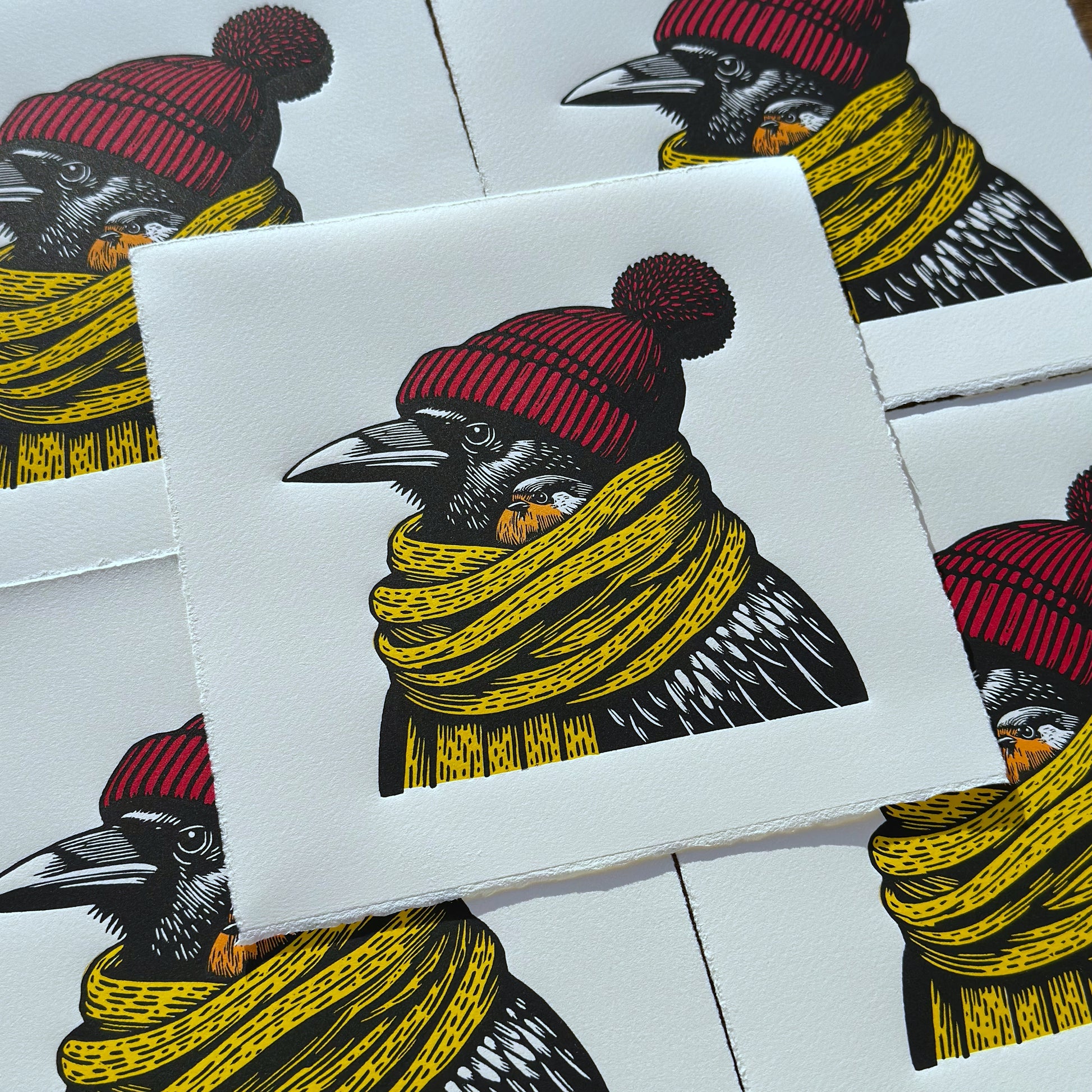 Back in 2024 when we had our first snow of the season and the first snow in our new home. We felt nothing could be more fitting than creating this print, which we had been working for a number of months. As the days grow shorter and colder, we all need to wrap up warmly with a large woolly scarf and a beanie and, of course, leave space for our little robin friend.